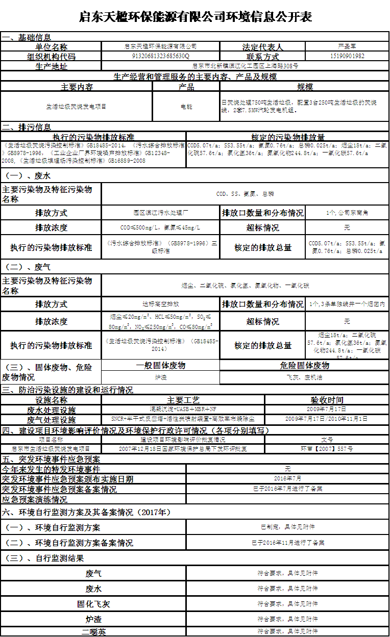 启东天楹环保能源有限公司2017上半年环境监测数据汇总
