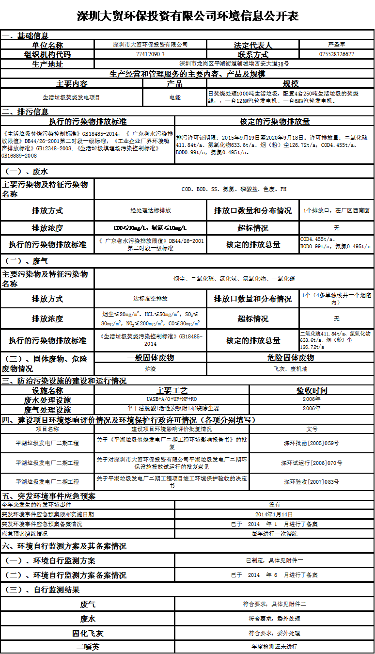 深圳市大贸环保投资有限公司2016年环境信息公开表