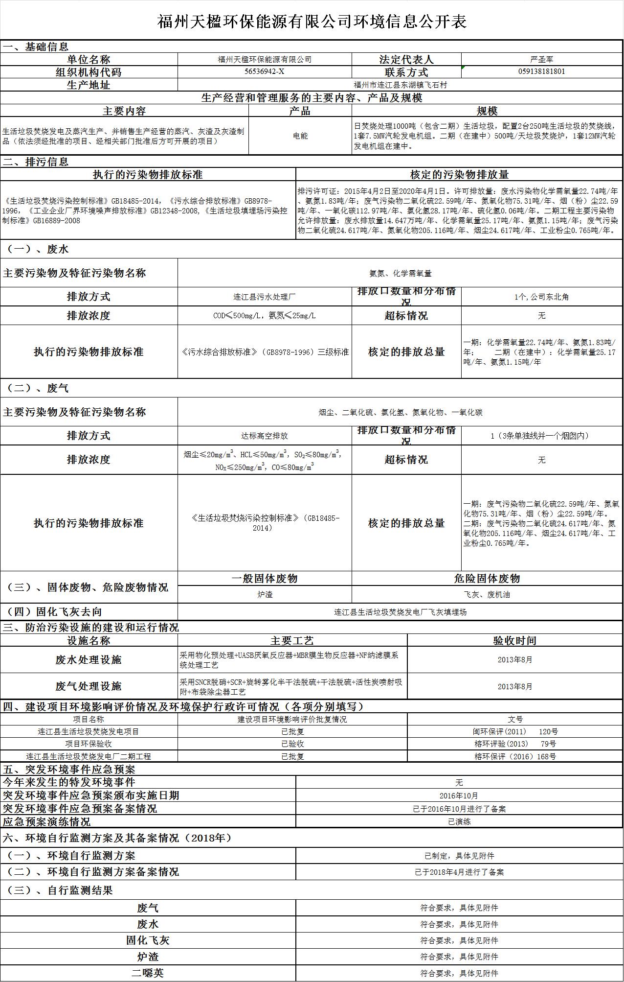 福州天楹环保能源有限公司2018年环境信息公开表