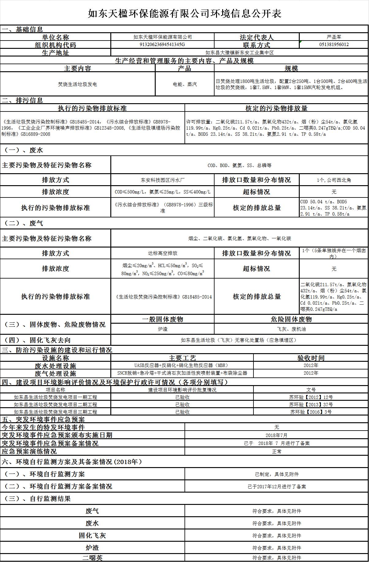 如东天楹环保能源有限公司2018年环境信息公开表