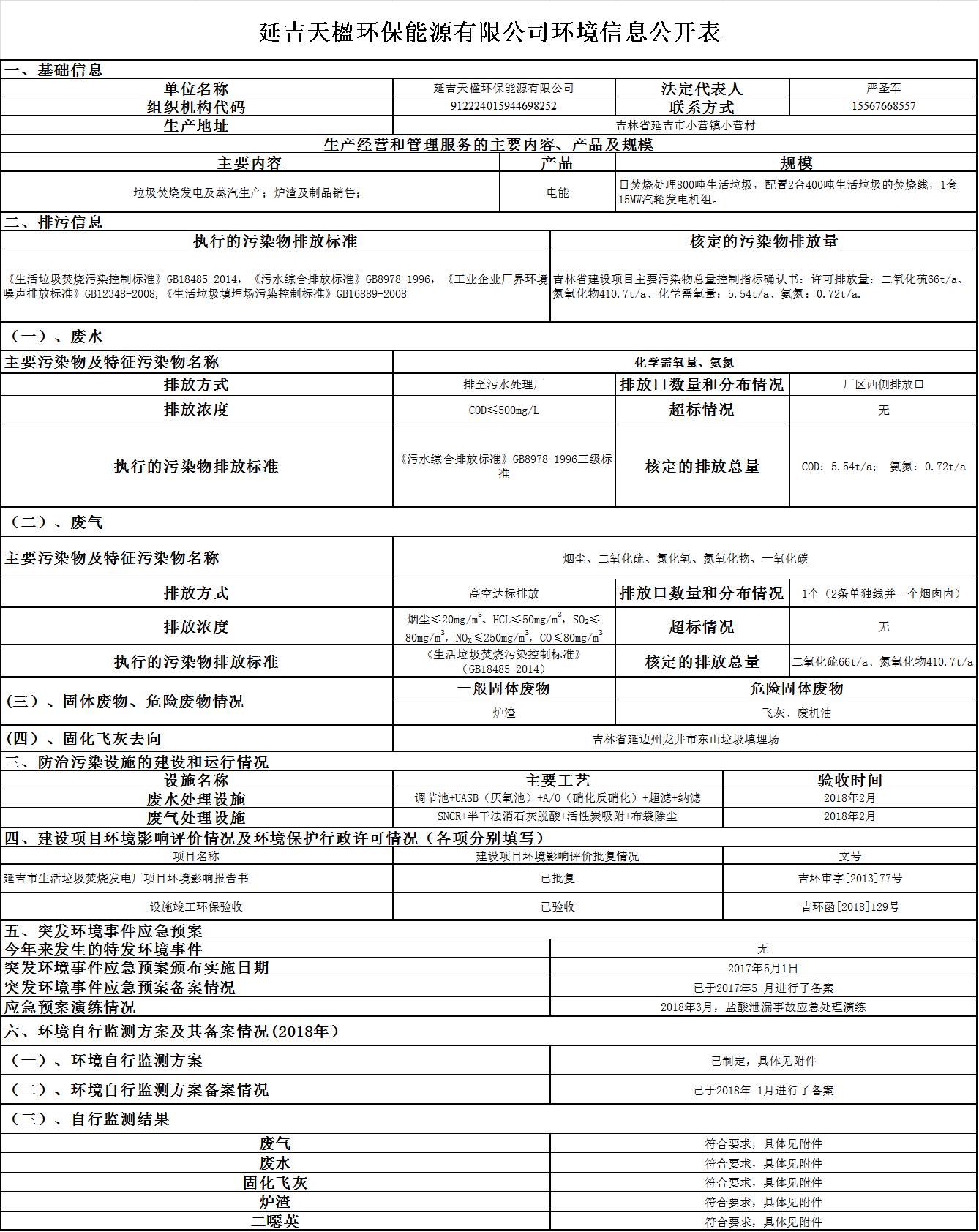延吉天楹环保能源有限公司2018年环境信息公开表