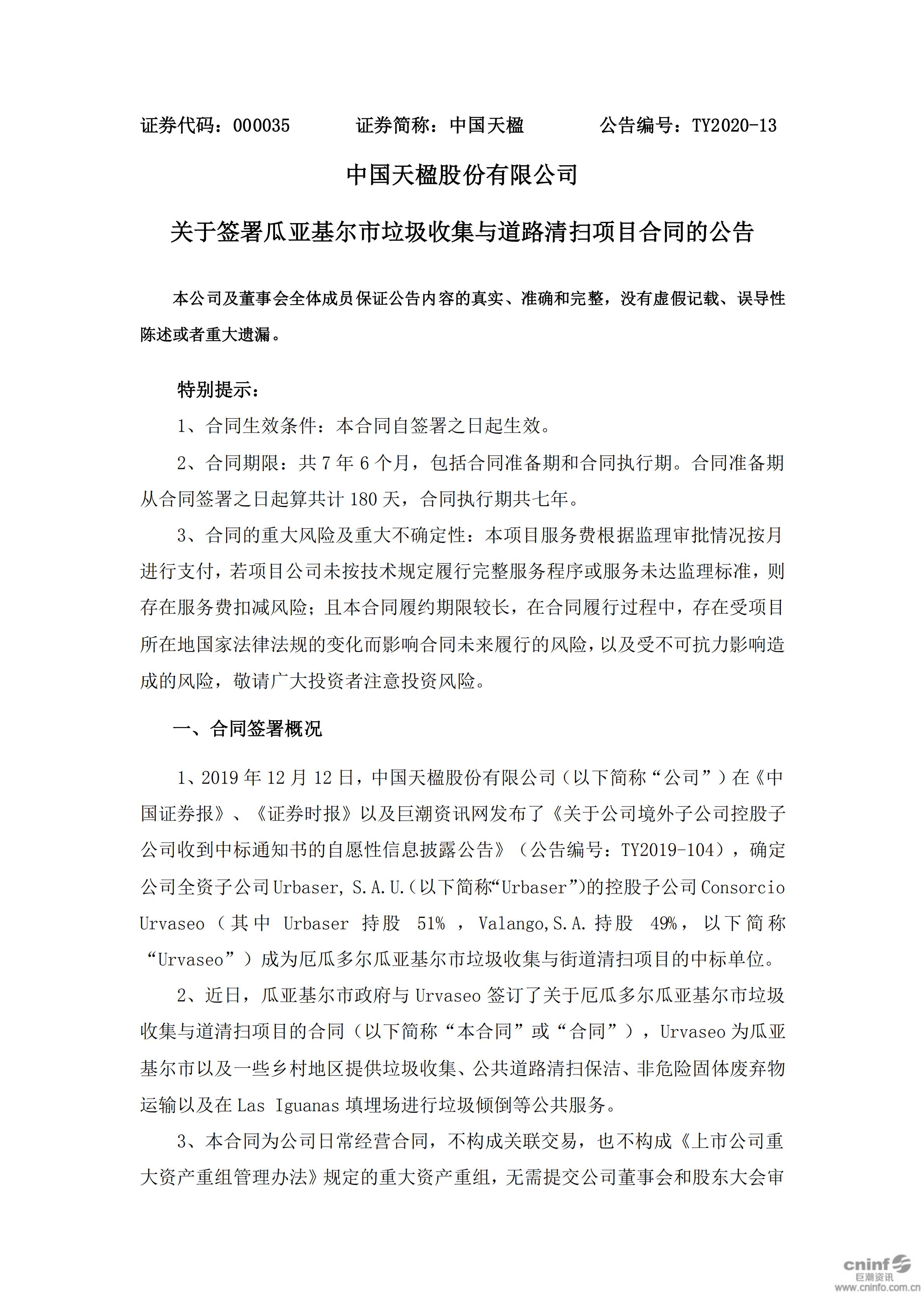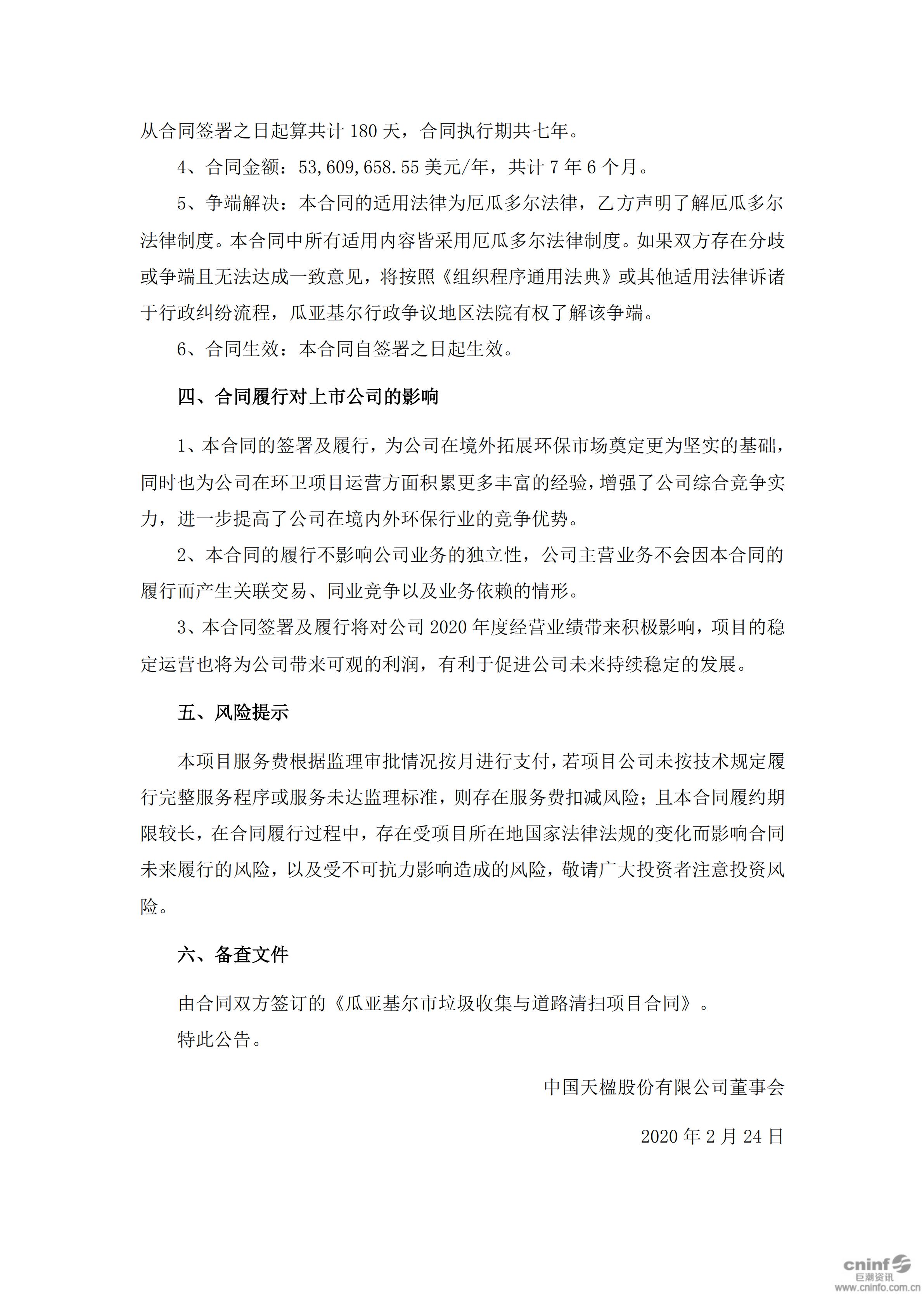 中国天楹:关于签署瓜亚基尔市垃圾收集与道路清扫项目合同的公告